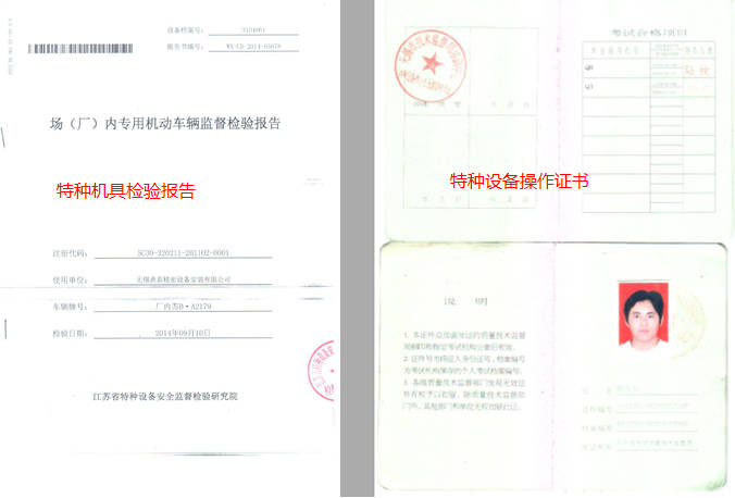 3. 特种设备操作员持有质监局颁发操作证,特种设备具有质监局颁发《检验报告》